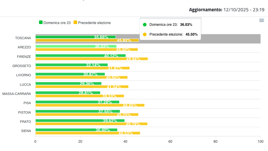 Affluenza alle urne in forte calo nella tornata del 12 e 13 ottobre per la Regione Toscana. Il primo giorno di voto si è concluso alle 23 della domenica 12 ottobre con la percentuale, in tutta la regione, intorno al 35 per cento rispetto al 45,70% del 2020. Vola l'astensionismo.