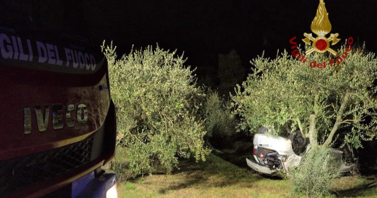 L'auto con quattro persone a bordo è uscita di strada è sfuggita al controllo del conducente ed è finita tra le piante di olivo dove si è ribaltata.