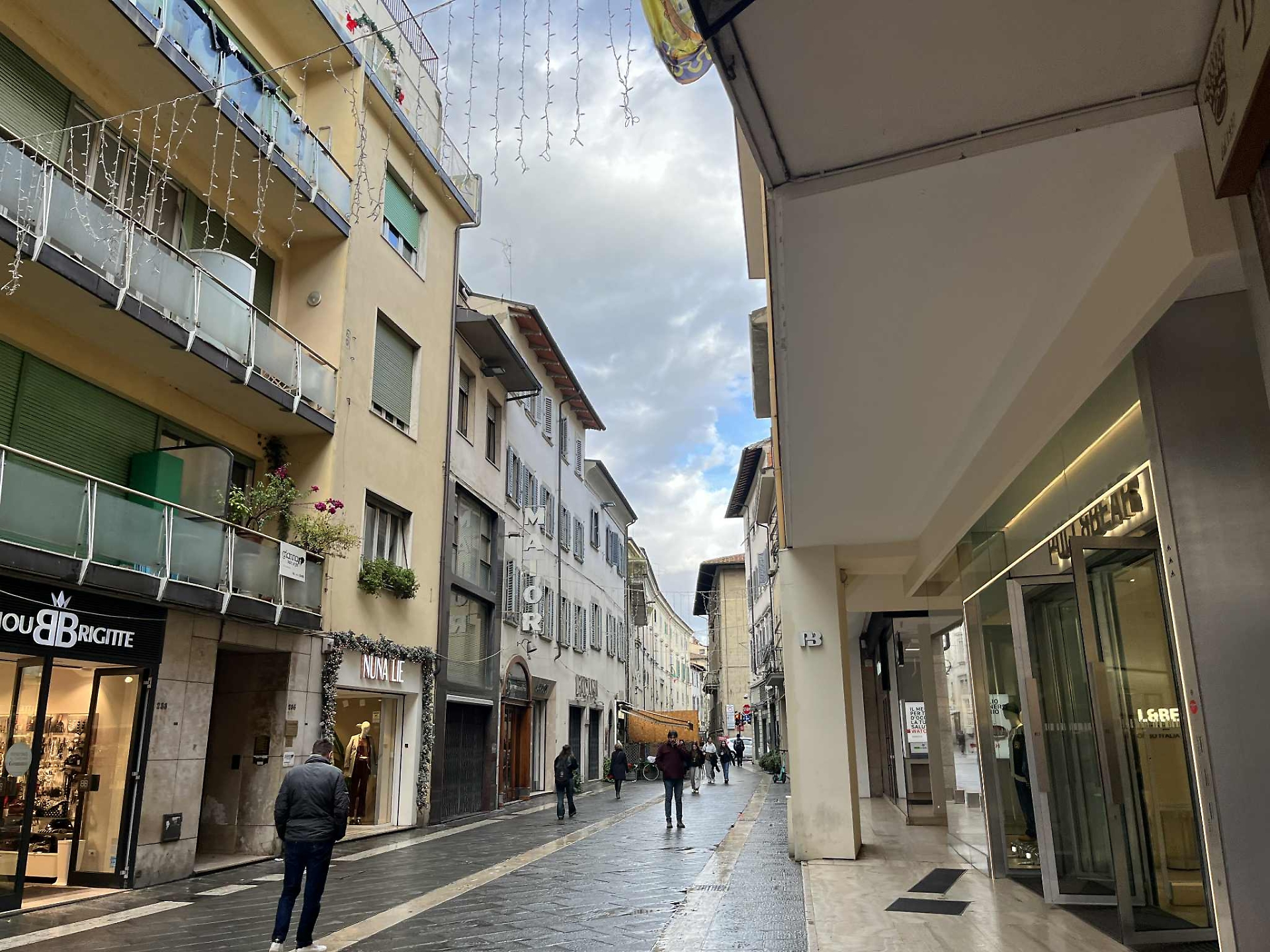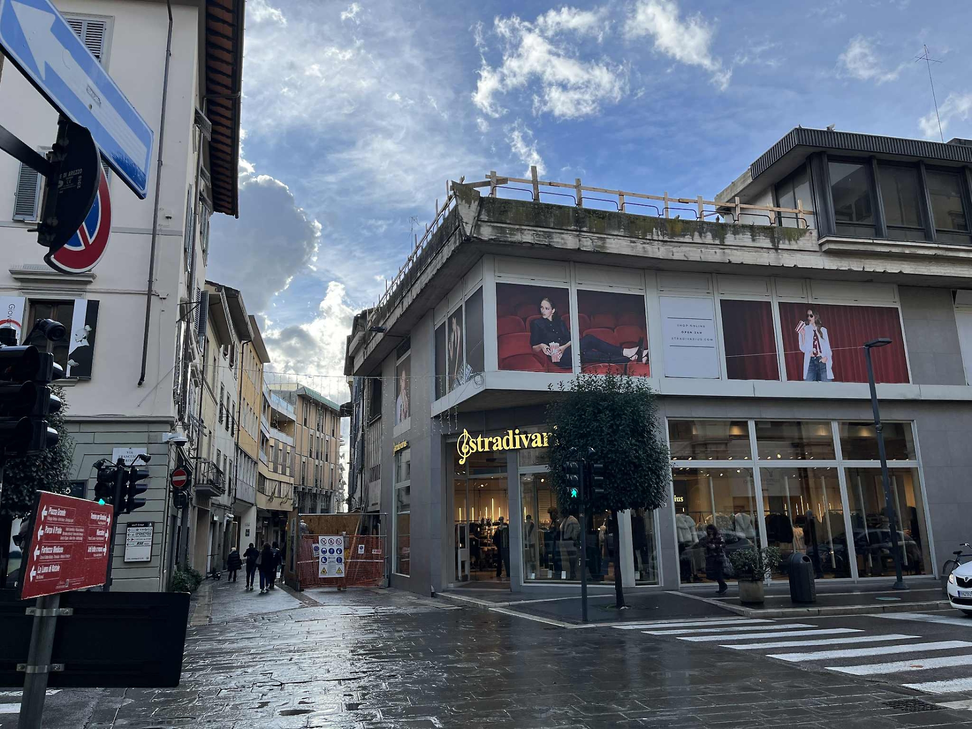 Il palazzo risale al 1970 e venne costruito al posto di una casa per ospitare la Banca Toscana, istituto di credito che in tempi più recenti è stato acquisito da Mps. Siamo nella parte bassa del Corso, sotto il semaforo tra via Roma e via Crispi. Dove il colosso spagnolo Inditex ha posizionato come sul tabellone di Monòpoli le sue insegne: Zara in piazza San Jacopo, Pull&Bear nella ex Galleria Renato, e appunto Stradivarius.
