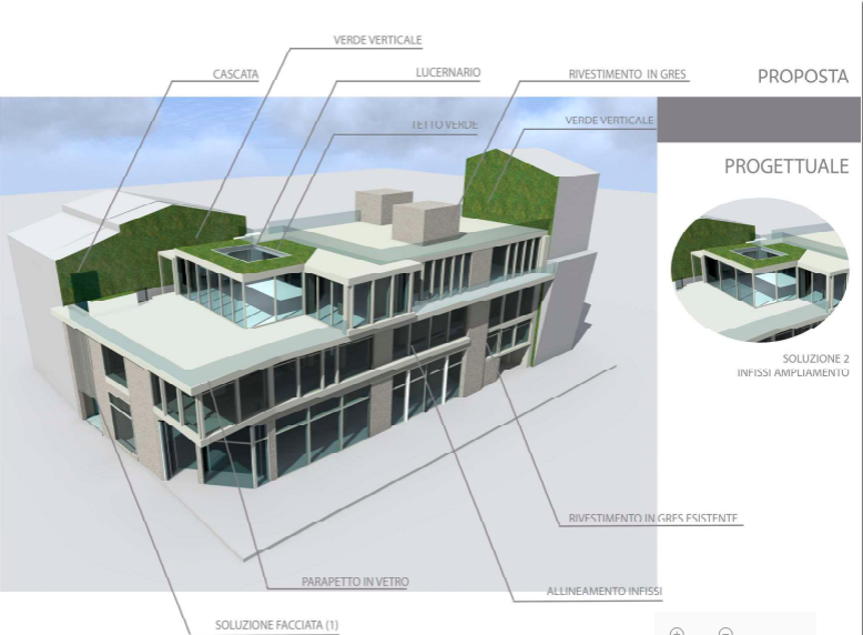 L'accesso con elevatori e scale avviene da Corso Italia, attraverso vano scala e ascensore, i locali di servizio sono previsti nel locale interrato.