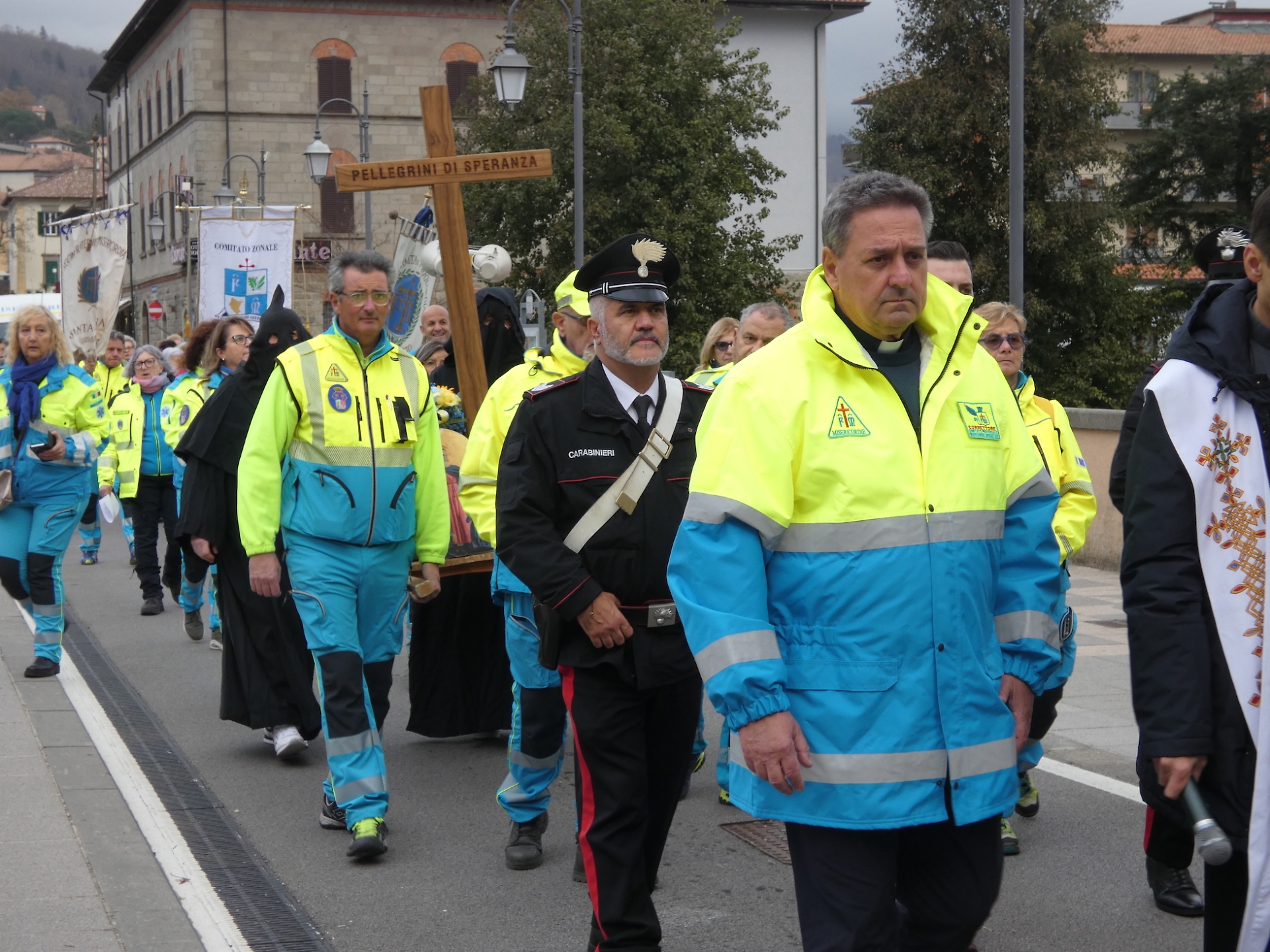 Da qui nel pomeriggio – dopo che molte persone di Arezzo hanno potuto farle visita – l’Icona Croce del Giubileo è stata portata per le strade di Arezzo dal Governatore Pier Luigi Rossi dalla Chiesa in processione (partecipanti molti confratelli e consorelle sia di Arezzo sia di altre Misericordie) fino in Cattedrale per la S. Messa solenne officiata nella cappella della Madonna del Conforto dal Correttore spirituale nazionale delle Misericordie d’Italia il vescovo monsignor Franco Agostinelli.
