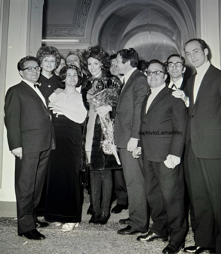 Ornella Vanoni attorniata da un gruppo di cittadini di Cortona (Arezzo) al Teatro Signorelli. Una foto in bianco e nero saltata fuori dal cassetto dei ricordi (Archivio Lamentini) che suscita nostalgia per i tempi andati, all'indomani dell'addio alla cantante.