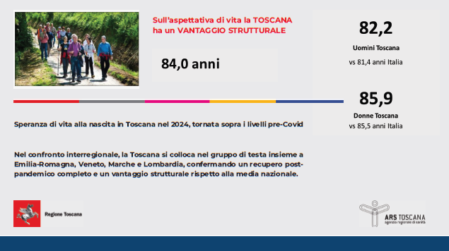 I dati sono stati presentati a Palazzo Strozzi Sacrati, sede della presidenza della giunta regionale, alla presenza dello stesso Giani, del coordinatore dell’Osservatorio di epidemiologia dell’Ars Fabio Voller e del direttore sanità e commissario Ars Federico Gelli. Un appuntamento che, più che una semplice illustrazione tecnica, è diventato la fotografia di un modello organizzativo consolidato. "Il risultato – evidenzia ancora il presidente – è che la Toscana supera in tutti i parametri la media nazionale e spesso si trova nell’area di vertice della classifica: nella regione la qualità della vita si conferma alta, sotto molteplici aspetti". Il primo indicatore è l’aspettativa di vita, tornata pienamente sopra i livelli pre Covid. Alla nascita ha raggiunto gli 84 anni complessivi: 82.2 per gli uomini, contro una media nazionale di 81.4, e 86.1 per le donne, rispetto agli 85.5 a livello italiano. Solo Veneto, Emilia-Romagna e Trentino-Alto Adige fanno leggermente meglio, in una competizione giocata sul filo dei decimi. Un risultato che assume un valore ancora maggiore se inserito nel contesto demografico. Nel 2024 i nati sono stati 20.725, mentre gli ultrasessantacinquenni rappresentano il 26,7 per cento di una popolazione di circa 3 milioni e 600 mila abitanti. La Toscana invecchia, come il resto del Paese, ma riesce a farlo mantenendo buoni livelli di salute.