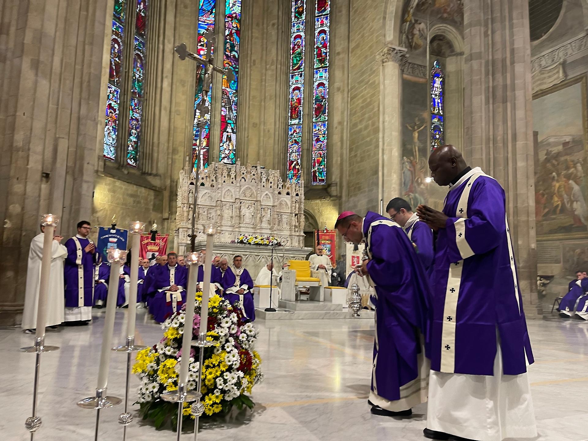 Una cattedrale gremita per l’ultimo saluto all’arcivescovo Riccardo Fontana, vescovo emerito di Arezzo, Cortona e Sansepolcro. Alla messa in duomo, presieduta dal vescovo Andrea Migliavacca, erano presenti cardinali, vescovi, presbiteri, autorità civili e militari, ma anche tanti fedeli per salutare colui che è stato la guida spirituale della diocesi aretina dal 2009 al 2022, dopo aver retto in precedenza la diocesi di Spoleto-Norcia. “Voleva bene a tutti – racconta un fedele in cattedrale – era molto disponibile e sempre vicino ai poveri”. Sull’altare, insieme al labaro del Comune di Arezzo, anche quello di Forte dei Marmi, città natale di Fontana. Arezzo era la sua città adottiva: dopo l’episcopato, aveva scelto di rimanervi a vivere. Alla cerimonia funebre erano presenti la cognata e i due nipoti con i rispettivi figli. La liturgia si è aperta con un messaggio di cordoglio inviato dalla Santa Sede, a firma del segretario di Stato, il cardinale Pietro Parolin. Successivamente è stato letto quello della Cei, presieduta dal cardinale Matteo Maria Zuppi.