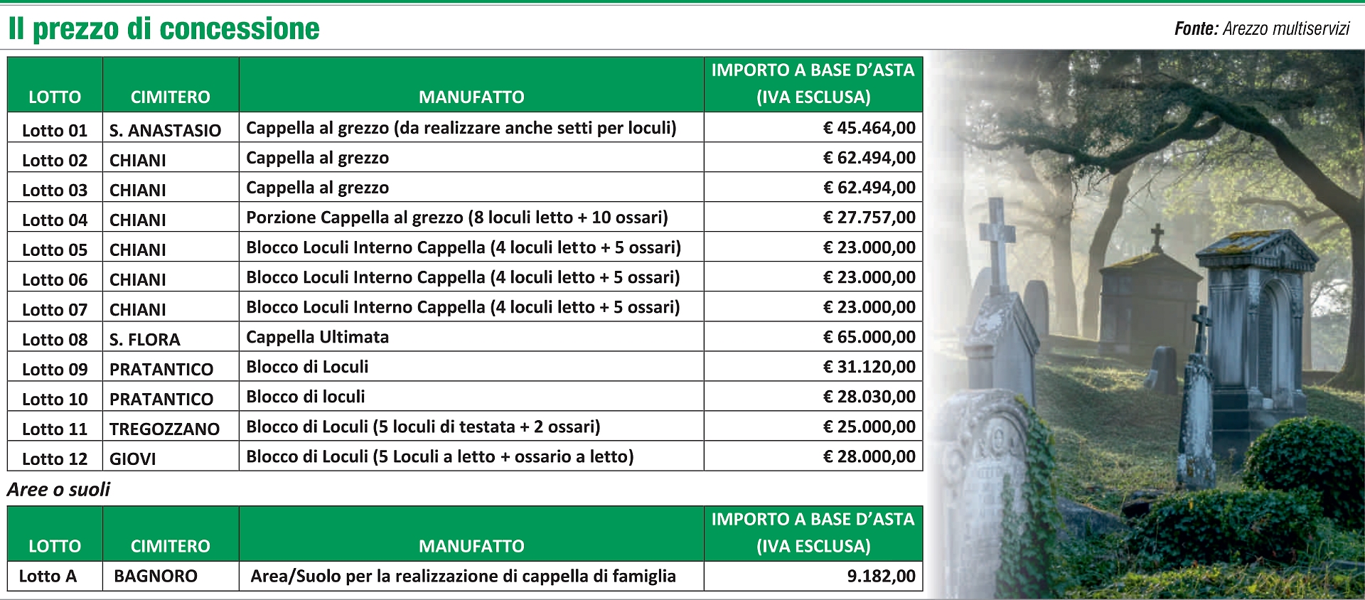 Ci sono dodici manufatti cimiteriali e un area suolo che si trovano sparsi nei vari cimiteri delle frazioni del comune di Arezzo, che sono all'asta. La indice la Multiservizi che in questi giorni è anche alle prese con una manutenzione straordinaria del forno crematorio. Ma andiamo per ordine.