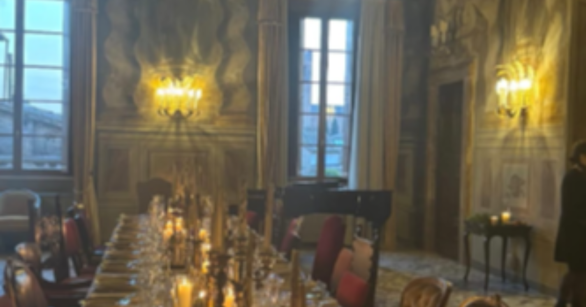Il menù della cena è stato curato dallo chef Luca Ciaffarafà. Secondo alcune indiscrezioni, tra le portate sono stati ordinati, tra gli altri, il risotto all’ortica, scaglie di tartufo estivo, mantecato con olio evo e non formaggio di anacardi; come secondo, una sinfonia di zucca e zucchini, ricotta vegana e confettura di finocchi. Non sono mancati i classici ricciarelli e i vini rossi locali, a sottolineare l’omaggio alla tradizione senese.