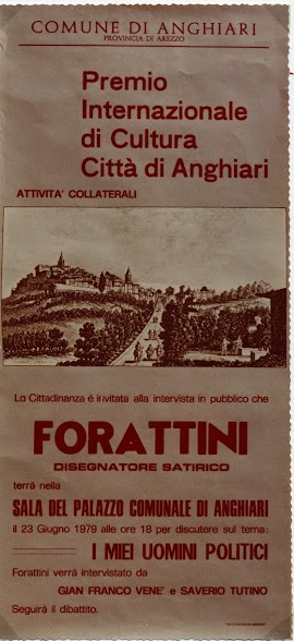 Era il 1979 quando Giorgio Forattini arriva ad Anghiari, invitato dall'allora sindaco Franco Talozzi e dal giornalista Gianfranco Vené e da Saverio Tutino, grande amico quest'ultimo di Giorgio Forattini. Il tema era "I miei uomini politici", era il 23 giugno 1979 come ricorda Franco Talozzi e la locandina che ha postato martedì 4 novembre, alla notizia della morte di Forattini all'età di 94 anni.