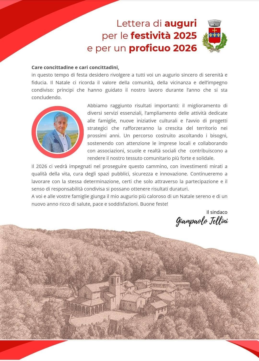 È l’inizio del biglietto di auguri di Giampaolo Tellini, sindaco di Chiusi della Verna. Un biglietto di carta che lo stesso sindaco recapiterà personalmente ad ogni famiglia di Chiusi della Verna. Una tradizione che il primo cittadino rispetta fin da quando è stato eletto sindaco, dieci anni fa (è al terzo mandato).