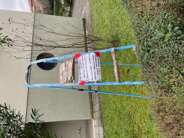 E così hanno preso uno scalandrino e ci hanno appeso un foglio con la preghiera di non mettere i bidoni lì davanti “per inquinamento e cattivo odore”.