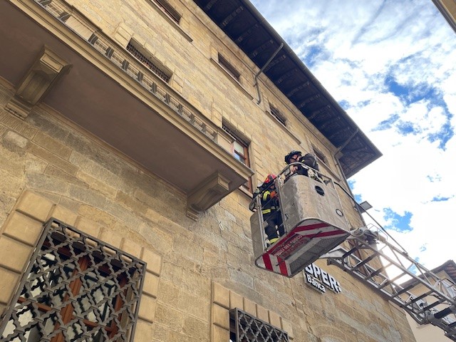 Piccione incastrato sulla rete della terrazza del palazzo dell'ex Banca Etruria per Corso Italia e salvato dai vigili del fuoco.