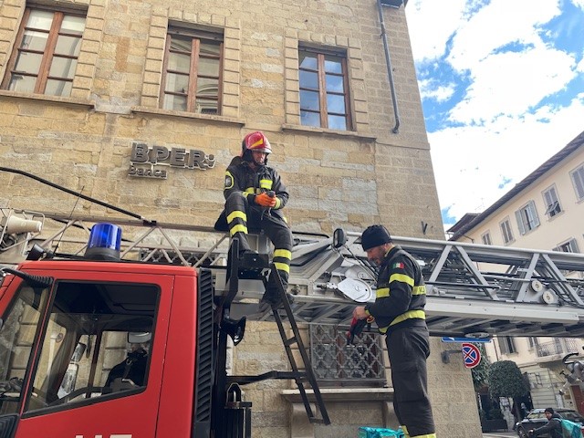 E così una camionetta è stata fatta arrivare, ha parcheggiato all'inizio di Corso Italia e due vigili del fuoco sono saliti per togliere il piccione dalla rete.