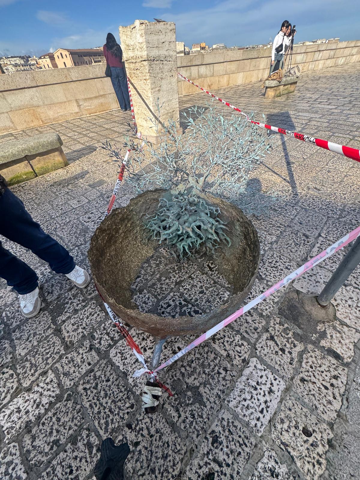 Potrebbe essere stato un tentativo di furto, e non il forte vento che ha interessato nelle ultime ore Matera, ad aver causato il danneggiamento di una scultura dell’artista di Castiglion Fiorentino (Arezzo) Andrea Roggi, installata in via Duomo, nel centro storico della città dei Sassi.