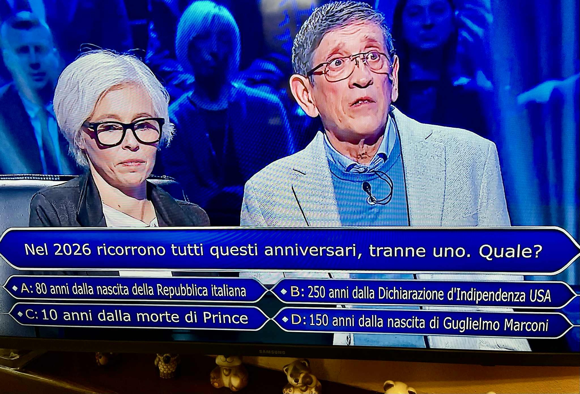 È stata poi la volta del suocero Franco (“è la memoria storica”) che ha aiutato Elena a scovare la risposta corretta sugli anniversari del 2026 (con Guglielmo Marconi che non ci incastrava nulla). A quel punto, a quota 100 mila, Elena ha chiesto la sostituzione (switch) della domanda sul numero di abitanti della Groenlandia (uguale a quello di Cerignola) ed ha affrontato il gradino che l'ha portata a 150 mila: con un valido ragionamento ha risposto che nel 1880 il grammofono ancora non esisteva a Londra.