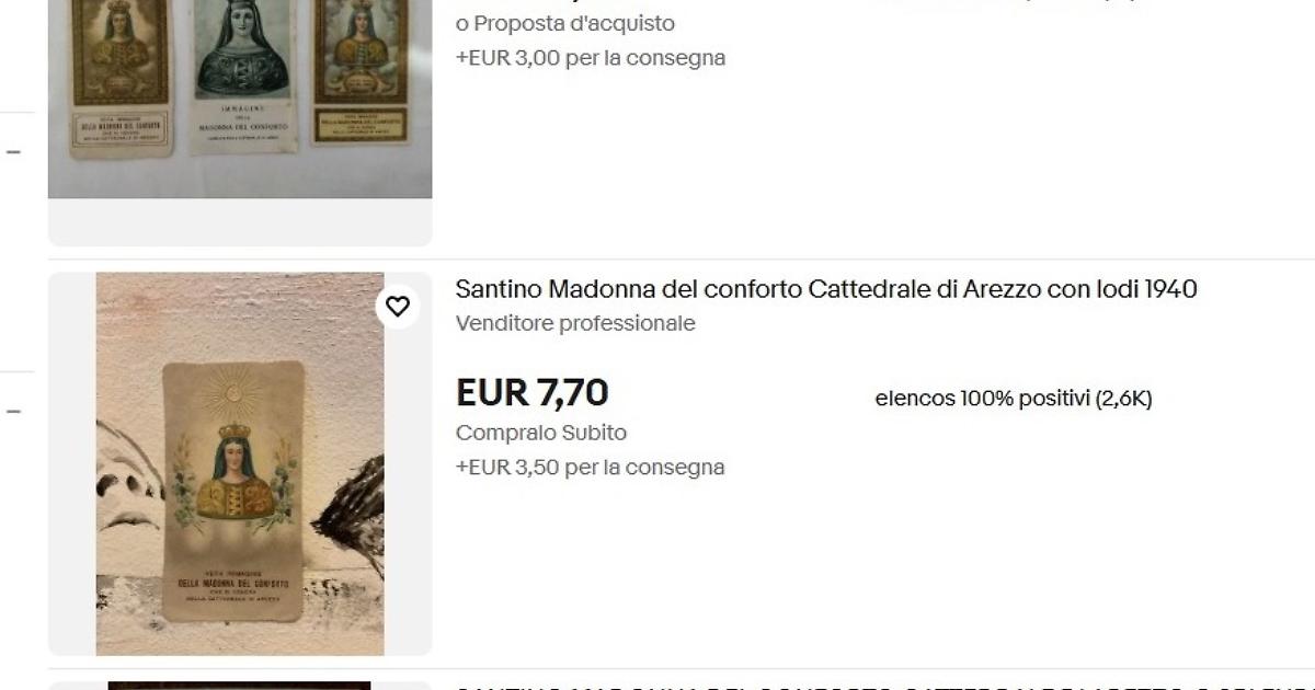 Scorrendo la pagina ce ne sono di tutti i prezzi. Per esempio: il santino Madonna del Conforto con lodi datato 1940 costa 7 euro e 70 centesimi. Si arriva a 12 euro per tre santini invece che riproducono l’immagine della Madonna del Conforto e che sono antichi. Nove euro invece per “la vera immagine della Madonna del Conforto. Quella che si venera nella cattedrale di Arezzo”, c’è scritto sotto. Esiste anche un lotto che costa 37 euro con sei santini di Arezzo. Tra questi la Madonna del Conforto e San Donato. Insomma un vero e proprio catalogo nel quale si trova anche il santino che ogni aretino conserva nel portafogli o in mezzo ad un libro e che si trova in cattedrale. Costa 2 euro e 50 più 3 euro di spese di spedizione.