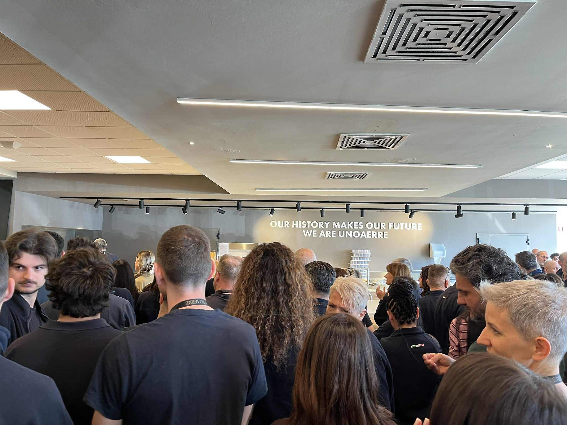 C'è la frase “We are Unoaerre” scritta a grandi lettere nel maxi pannello. E lo slogan: “la nostra storia crea il nostro futuro”.