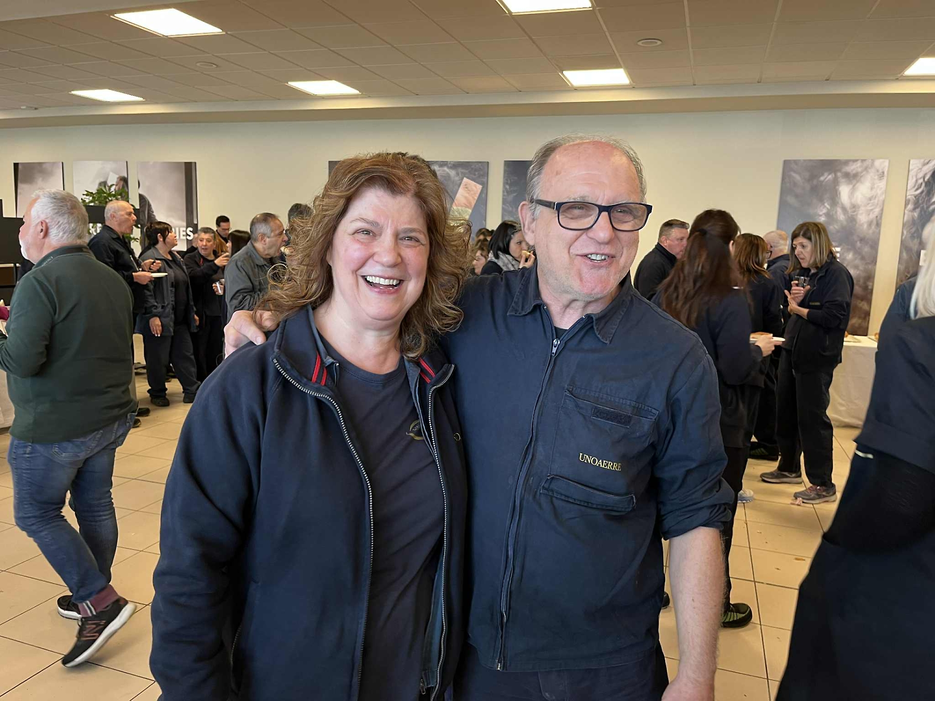 Tra i tanti lavoratori alla festa del 100°, Catia e Mauro, i più anziani del gruppo, con il meritato riposo che si avvicina, tra ricordi e futuro: “Speriamo per i colleghi e per chi verrà dopo di noi, che ci siano altri cento anni di Unoaerre”.