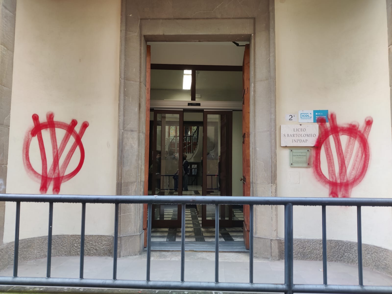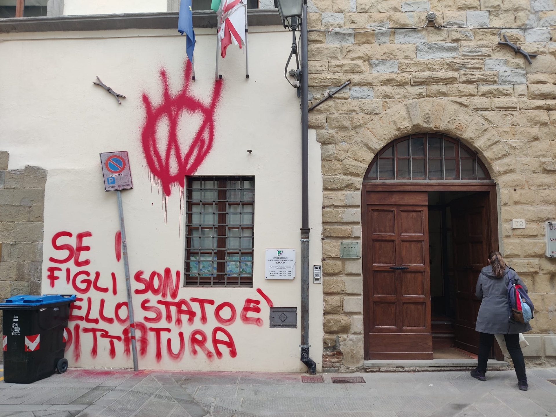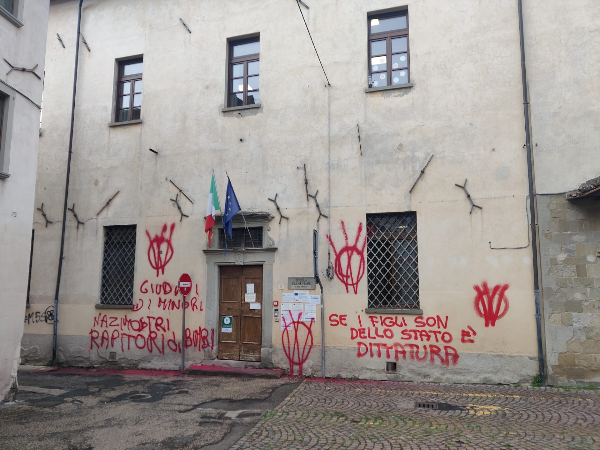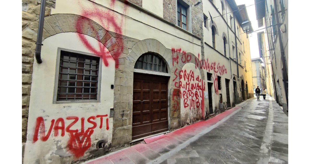 Scritte effettuate con una vernice rossa, con chiari riferimenti e simboli alla questione della “famiglia del bosco”; gli stessi già visti nella protesta di Vasto. A Caprese Michelangelo (Arezzo), nei mesi scorsi, è stato eseguito un provvedimento di allontanamento dei figli ad una coppia che non riconosce l'autorità statale. I fratelli si trovano in una struttura in esecuzione di un atto del Tribunale dei minori di Firenze.