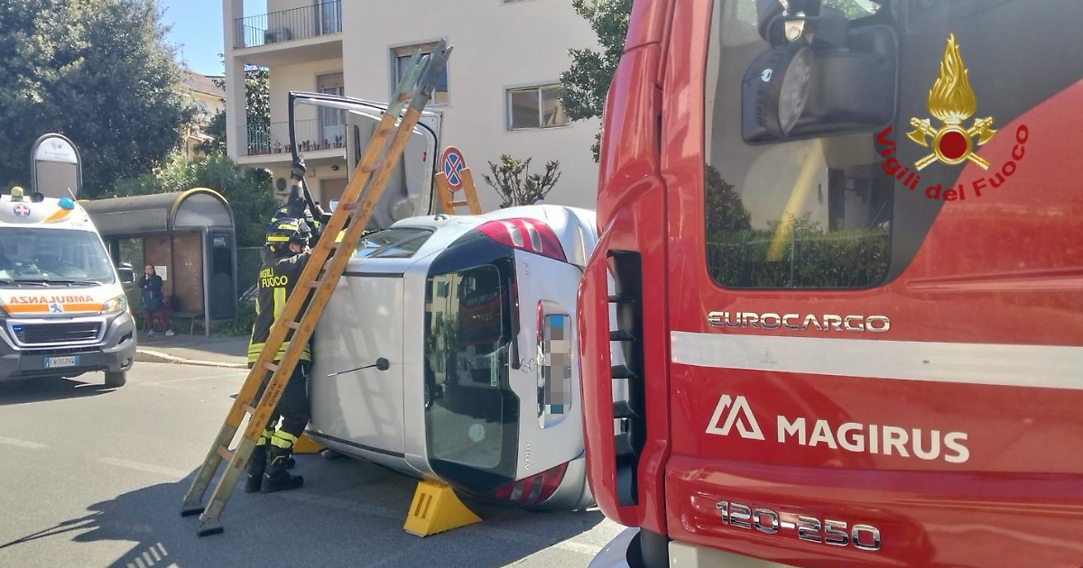 Auto ribaltata in via Cristoforo Colombo ad Arezzo. Coinvolto un uomo rimasto praticamente illeso. E' successo alle 11,20.