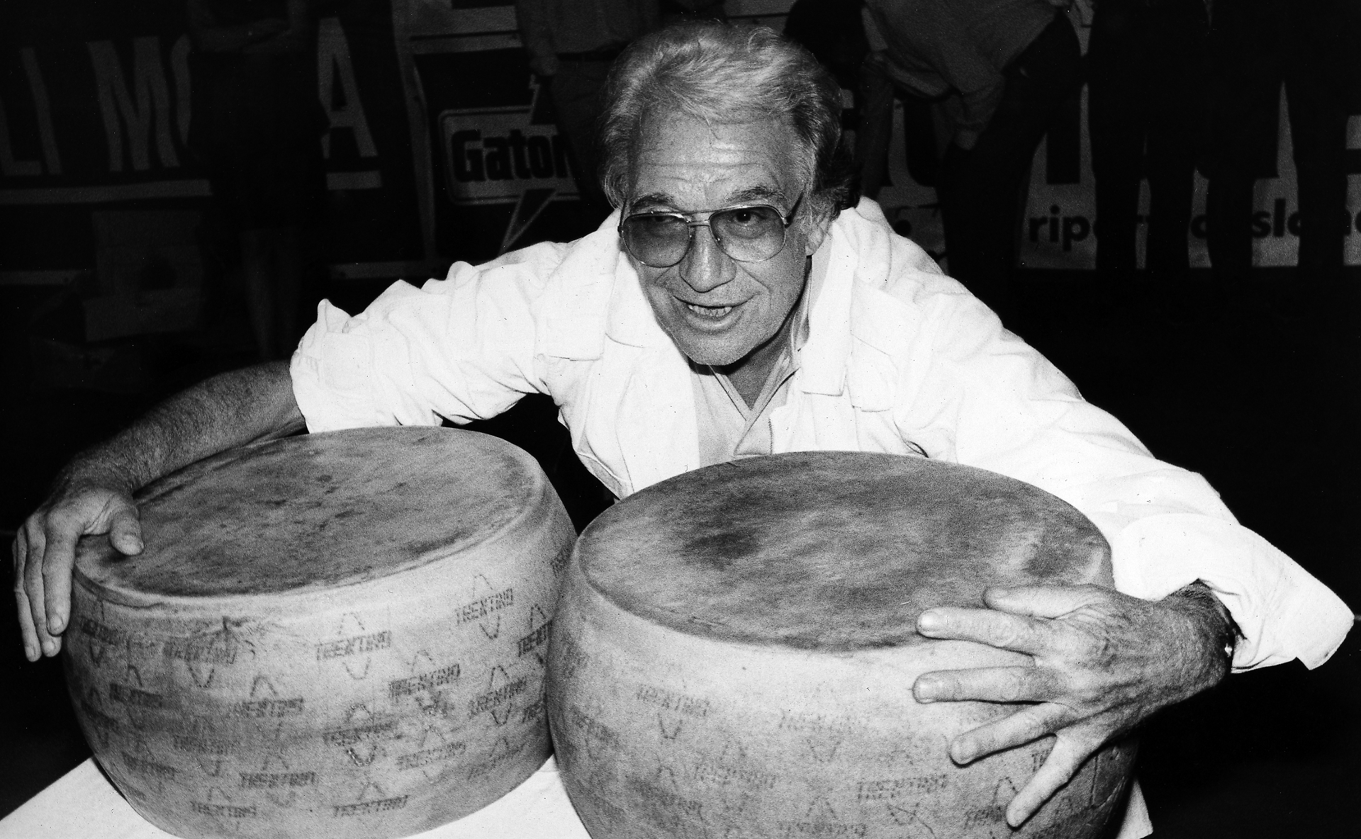 Ugo Tognazzi mentre abbraccia due grandi forme di parmigiano