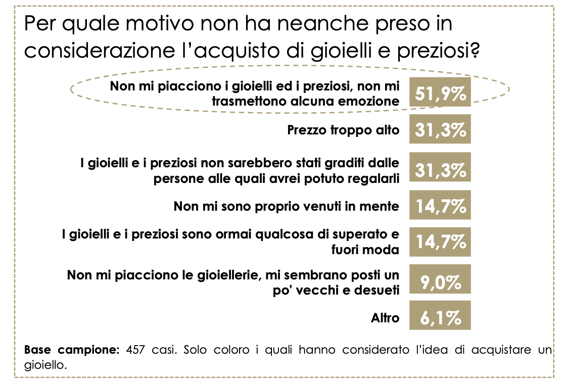 Anzi, spesso la gioielleria stessa diventa una barriera. L’atmosfera viene ricordata come fredda e austera nell’86,6% dei casi, poco accogliente nell’86,4%. Un luogo più simile a un tempio che a uno spazio di incontro. Il personale viene accusato di criticare lo stile del cliente, di esercitare pressione commerciale, di non saper ascoltare. Non sorprende allora che l’errore più grave attribuito ai gioiellieri sia proprio questo: non valorizzare le storie e le emozioni del prodotto.