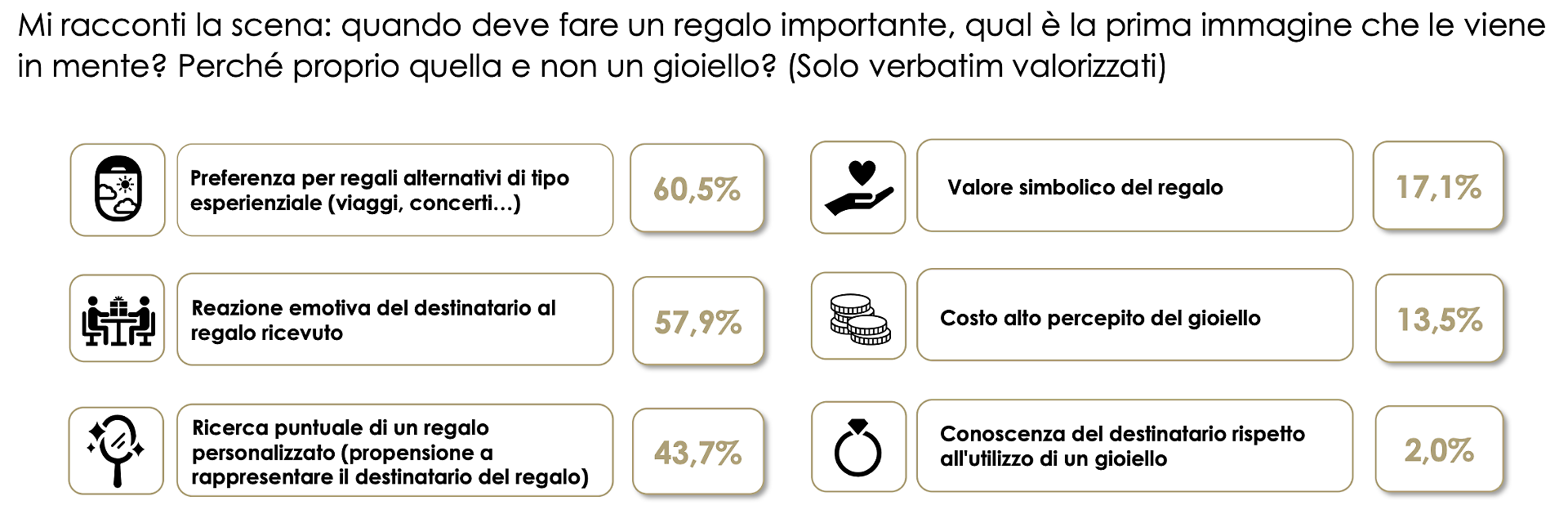 È questa la fotografia più sorprendente che emerge dalla ricerca presentata a Vicenzaoro, realizzata da Format Research su 806 italiani maggiorenni che, negli ultimi anni, non hanno preso in considerazione l’acquisto di un prezioso. Un’indagine che non interroga chi compra, ma chi non compra. E che finisce per raccontare molto di più: come è cambiato il nostro modo di attribuire valore, di fare regali, di ricordare. Quando si pensa a un dono importante – Natale, compleanni, anniversari, lauree – il gioiello non entra nemmeno nel repertorio spontaneo. Gli italiani pensano prima agli hobby (84,7%), all’abbigliamento, ai viaggi, alla tecnologia, ai concerti.