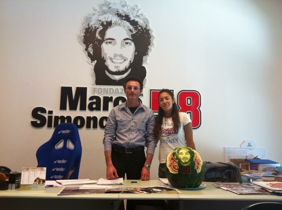 Mi ricordo molto bene quella data. Andai a vedere il museo dedicato a Marco Simoncelli. Mi accolse Kate, la fidanzata di Marco, a cui chiesi se potevo farle un regalo. Lei molto gentilmente mi disse che tutti i regali vanno accettati. E così presi la palla al balzo ed iniziai a scolpire. Mi vidi seduto a casa mia al tavolo con una foto del Sic e pensai di realizzarla in un cocomero. Iniziai. Foto sulla mano sinistra, penna e coltello sulla destra e via. Il primo cocomero fu realizzato per lui. Potrei continuare a scrivere all’infinito le emozioni che provai il giorno della consegna, ma molto probabilmente non basterebbero pagine e pagine per farvi capire che cosa ho percepito, provato e sentito quel momento. Era giugno 2014.