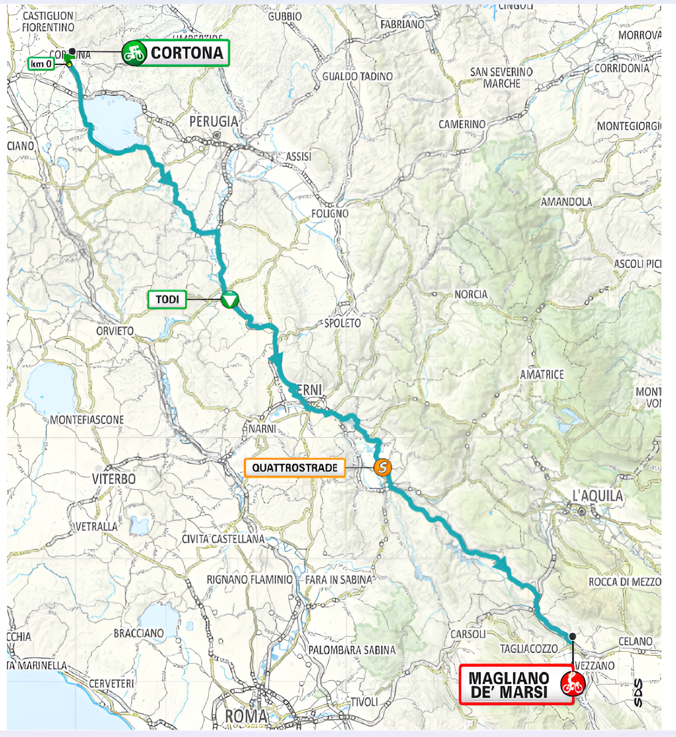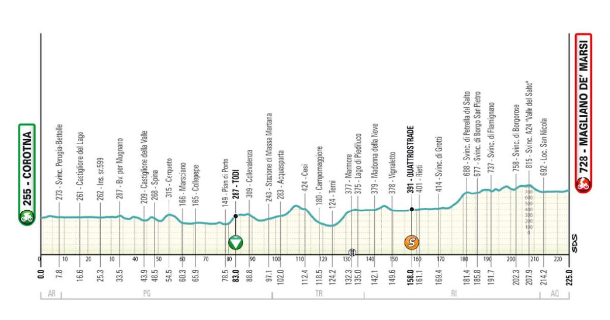 È la tappa più lunga della Tirreno-Adriatico 2026, 225 km, 1850 metri di dislivello, ma esclusa l'ultima frazione, è anche la più facile. I corridori attraverseranno ben 4 regioni: Toscana (la provincia di Arezzo), Umbria, Lazio e Abruzzo su un percorso prevalentemente ondulato. Finale veloce, sempre leggermente a salire per gli ultimi 15 km fino al rettilineo conclusivo (circa 3%).