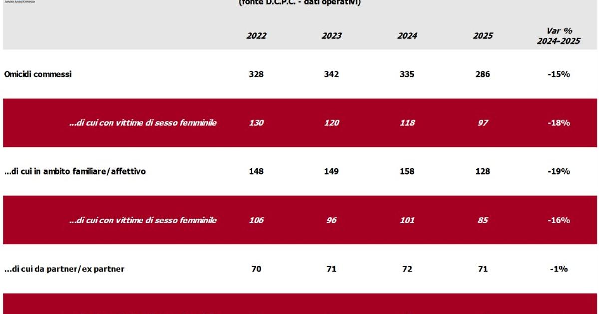 ROMA (ITALPRESS) - In base ai dati del Ministero dell'Interno emerge che nel corso del 2025 gli omicidi (tutti i casi di assassinio volontario indipendentemente dal genere della vittima) sono calati complessivamente del 15%, passando dai 335 del 2024 ai 286 dell'anno appena concluso, il numero più basso dell'ultimo decennio. I dati del Viminale indicano che la flessione riguarda in particolare la fattispecie specifica dei femminicidi, diminuiti del 18% nel 2025 rispetto al 2024. Sono state infatti 97 le donne assassinate lo scorso anno rispetto alle 118 del 2024, alle 120 nel 2023 e alle 130 del 2022. Tra le 97 vittime del 2025 si segnala che 85 sono state uccise per mano di un soggetto riconducibile all'ambito familiare-affettivo, una casistica che segna un -16% rispetto al 2024. - Foto ufficio stampa Ministero dell'Interno - (ITALPRESS). sat/com 19-Gen-26 16:04