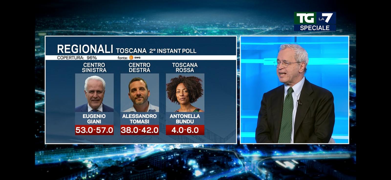 Ore 15.40: Il secondo instant poll condotto da Swg-TgLa7 con copertura del 96% vede Eugenio Giani favorito con una forbice tra il 53-57%; Tomasi tra il 38-42%, Bundu tra 4-6%.