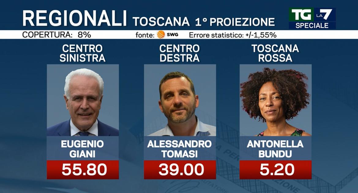 Ore 16: Secondo la prima proiezione del Consorzio Opinio Italia per Rai, con una copertura del campione del 6%, alle elezioni regionali in Toscana, il presidente della Regione uscente, candidato del campo largo di centrosinistra, Eugenio Giani, è al 54,6% mentre il sindaco di Pistoia Alessandro Tomasi, candidato per il centrodestra, è al 40,6%. Antonella Bundu, sostenuta da Toscana Rossa, la lista che mette insieme Rifondazione comunista, Potere al Popolo e Possibile, è al 4,8%.