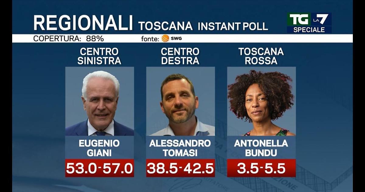 Chiuse le urne, la Toscana ha votato il nuovo presidente della Regione tra i candidati Eugenio Giani (centrosinistra), Alessandro Tomasi (centrodestra) e Antonella Bundu (Toscana Rossa). Dalle ore 15 di oggi lunedì 13 ottobre è iniziato lo spoglio e TgLa7, condotto dal direttore Enrico Mentana, ha diffuso in diretta gli instant poll Swg che delineano - dai seggi - un primo quadro sulla tendenza di voto degli elettori. Ecco i risultati con copertura dell'88%: Eugenio Giani (53 - 57%), Alessandro Tomasi (38.5- 42.5), Antonella Bundu (3.5-5.5).