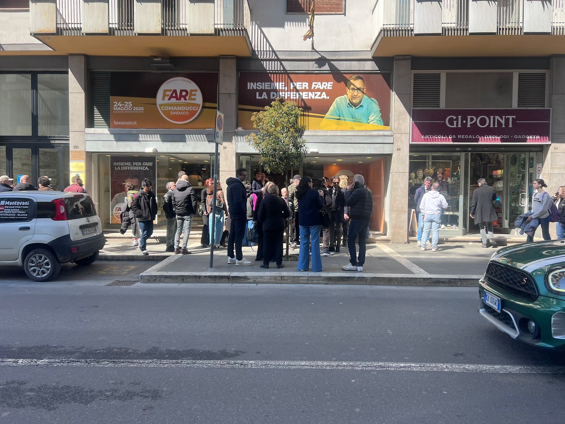 C’è una postazione con due poltroncine in vetrina per le interviste e c’è una postazione all’interno dove qualsiasi cittadino può entrare per dire ciò che non va di Arezzo o per fare nuove proposte. Ma soprattutto c’è tantissima gente al taglio del nastro del nuovo punto elettorale della lista civica Fare del candidato a sindaco del centrodestra, Marcello Comanducci.