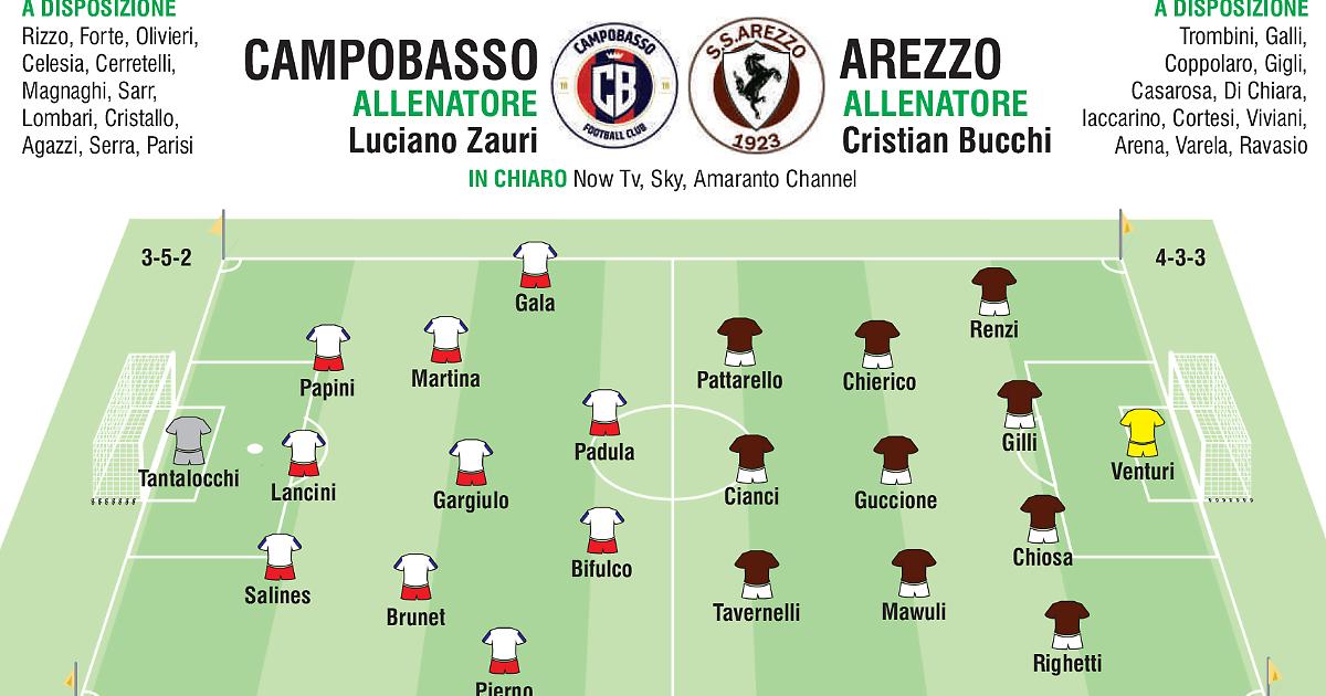Bucchi non ha tenuto la consueta conferenza alla vigilia, per cui le scelte di formazione resteranno un rebus. Non dovrebbero esserci dubbi in difesa: Chiosa e Gilli i centrali, con Renzi e Righetti sulle zone basse. A centrocampo, Ionita è ancora fuori e Viviani non ha la forma per iniziare; dunque, spazio a Guccione, Chierico e Mawuli. Davanti, l’unico ballottaggio riguarda il centravanti: Cianci - in gol nella sconfitta di mercoledì con la Ternana -, o Ravasio?