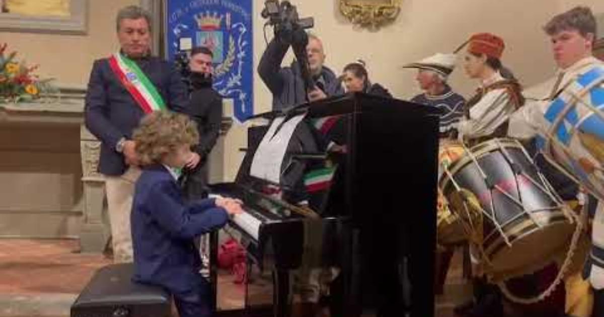 Il bambino prodigio Alessandro Gervasi suona il pianoforte a Castiglion Fiorentino, prima di sapere che lo strumento gli sarà dato in regalo.