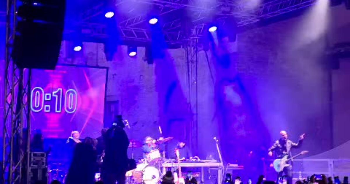Piazza della Libertà invasa dalla gente, il conto alla rovescia e l'arrivo del 2026 con Sarà perché ti amo come sottofondo musicale.