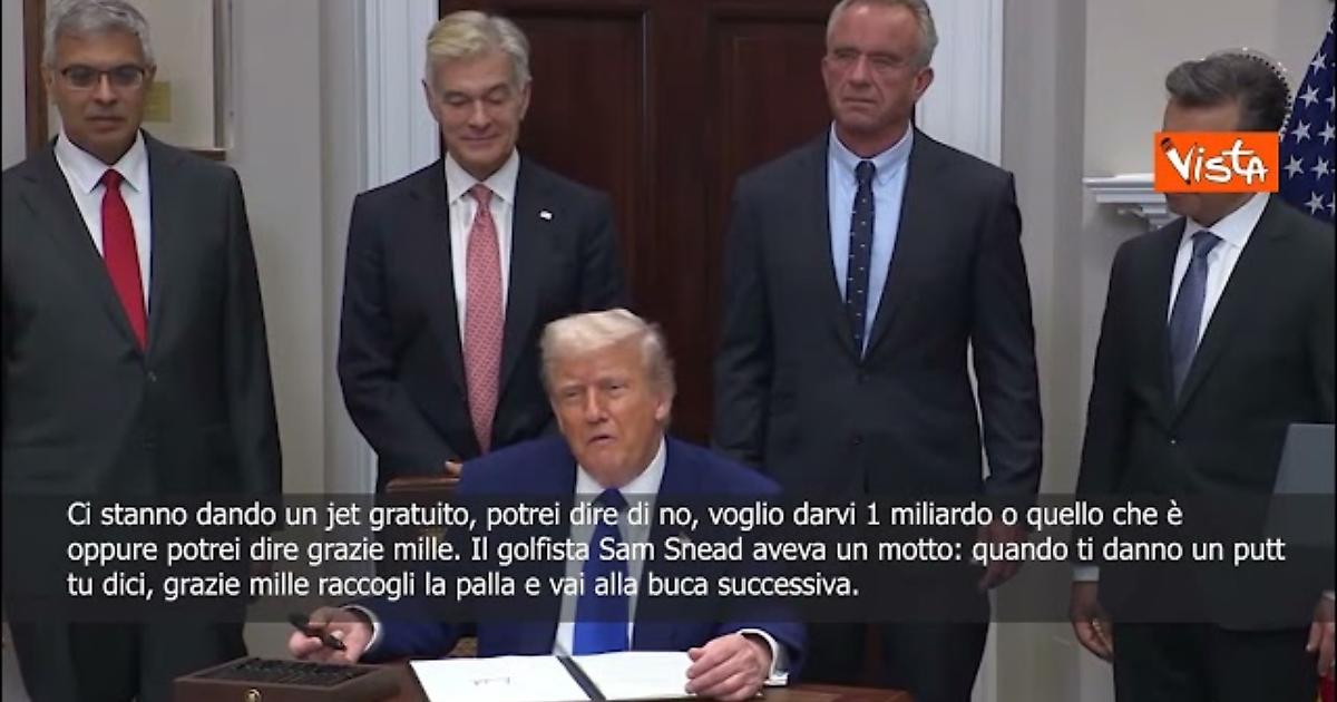 “Ci stanno dando un jet gratuito. Potrei dire di no, no, no. Non date. Voglio darvi 1 miliardo o 400 milioni o quello che è. Oppure potrei dire grazie mille.” Così il Presidente degli Stati Uniti Donald Trump in una conferenza stampa sull'aereo privato donato dal Qatar a Donald Trump.