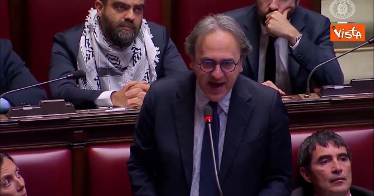 Il deputato di Avs Marco Grimaldi con la kefiah palestinese in Aula per il Premier Time della Presidente Meloni alla Camera.