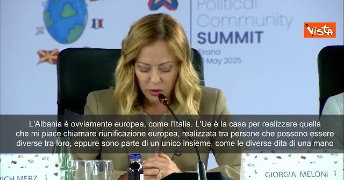 (Agenzia Vista) Tirana, 16 maggio 2025 "L'Albania è ovviamente europea, come l'Italia, la Serbia, la Norvegia, al di là se siano parte di questa o quella organizzazione. L'Ue è la casa per realizzare quella che mi piace chiamare riunificazione europea, realizzata tra persone che possono essere diverse tra loro, eppure sono parte di un unico insieme, come le diverse dita di una mano". Lo ha detto il premier Giorgia Meloni parlando alla sessione plenaria del summit della Comunità politica europea a Tirana. Chigi Fonte: Agenzia Vista / Alexander Jakhnagiev