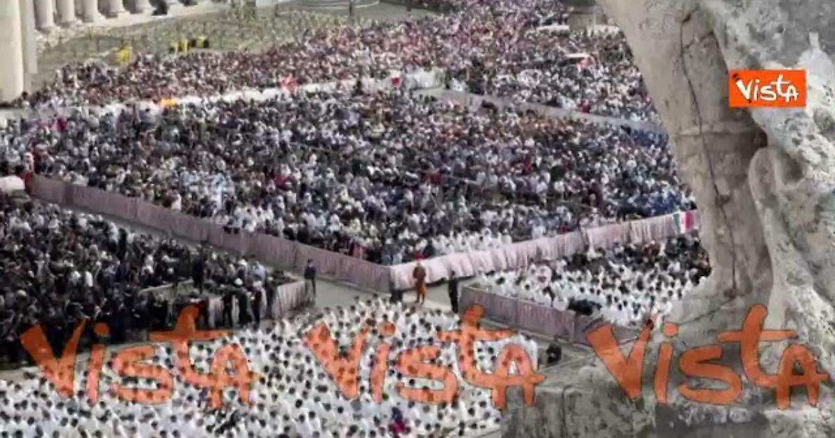 La Messa di insediamento di Papa Leone XIV a San Pietro. I fedeli sono accordi in migliaia alla cerimonia.