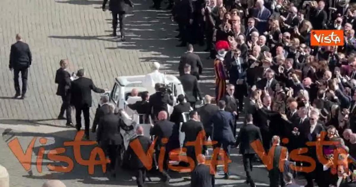 Papa Leone XIV saluta i fedeli a bordo della Papamobile prima della Messa per l'insediamento a San Pietro.