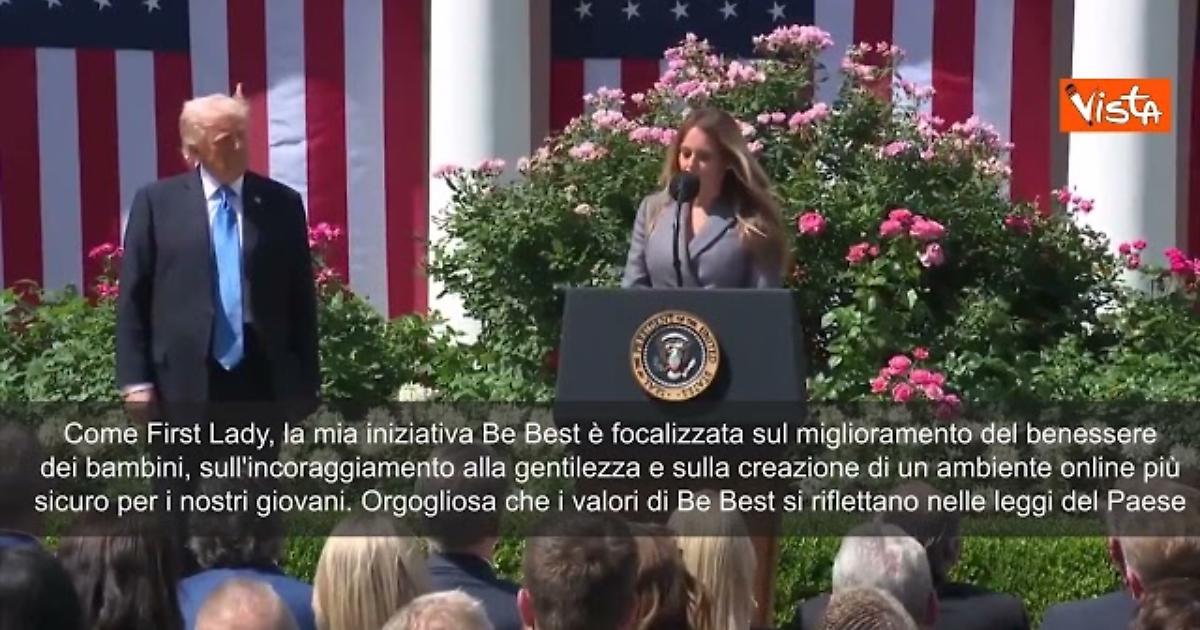 "Come First Lady, la mia iniziativa Be Best è focalizzata sul miglioramento del benessere dei bambini, sull'incoraggiamento alla gentilezza e sulla creazione di un ambiente online più sicuro per i nostri giovani. Orgogliosa che i valori di Be Best si riflettano nelle leggi del Paese", così Melania Trump in occasione della firma della legge contro il revenge porn nel Giardino delle Rose della Casa Bianca.