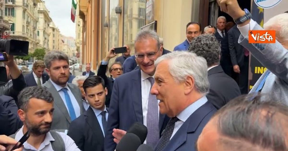 Il ministro degli esteri Antonio Tajani fa una foto con il candidato sindaco di centro destra di Genova Pietro Piciocchi: "Sei troppo alto, portatemi uno sgabello".