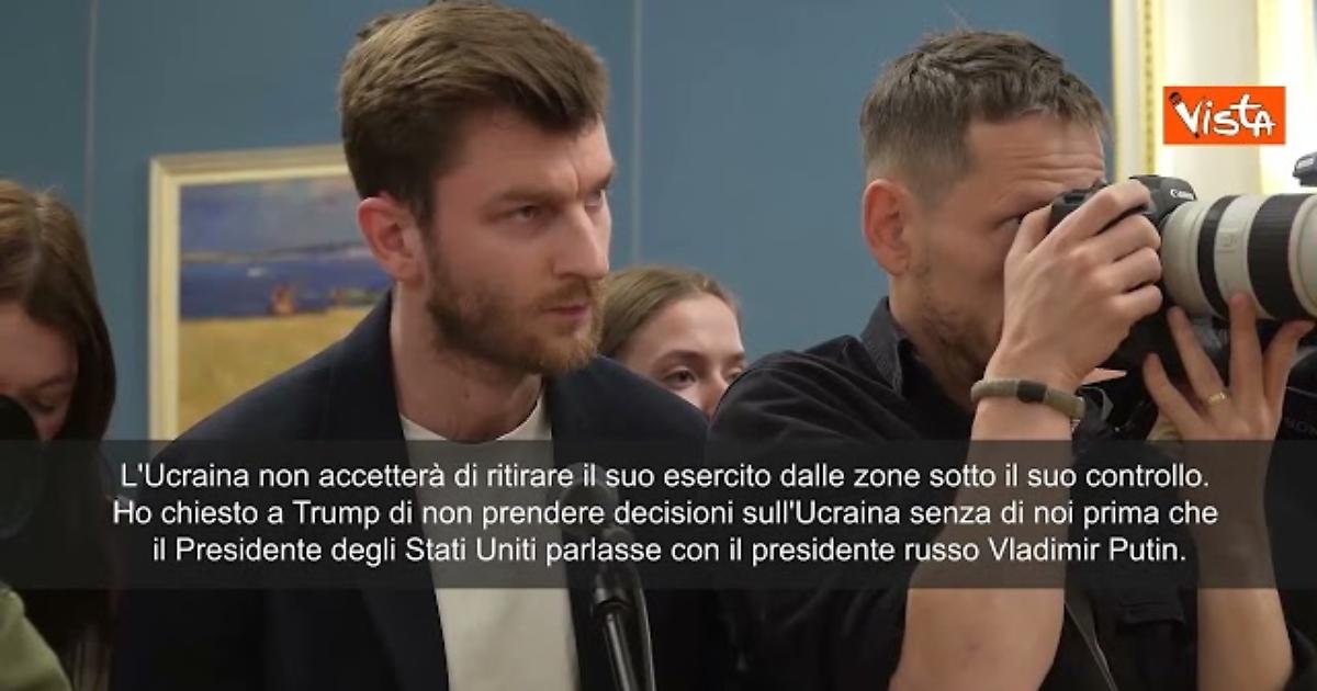 "L'Ucraina non accetterà di ritirare il suo esercito dalle zone sotto il suo controllo. Ho chiesto a Trump di non prendere decisioni sull'Ucraina senza di noi prima che il presidente degli Stati Uniti parlasse con il presidente russo Vladimir Putin". Lo ha detto il Presidente ucraino Zelensky.