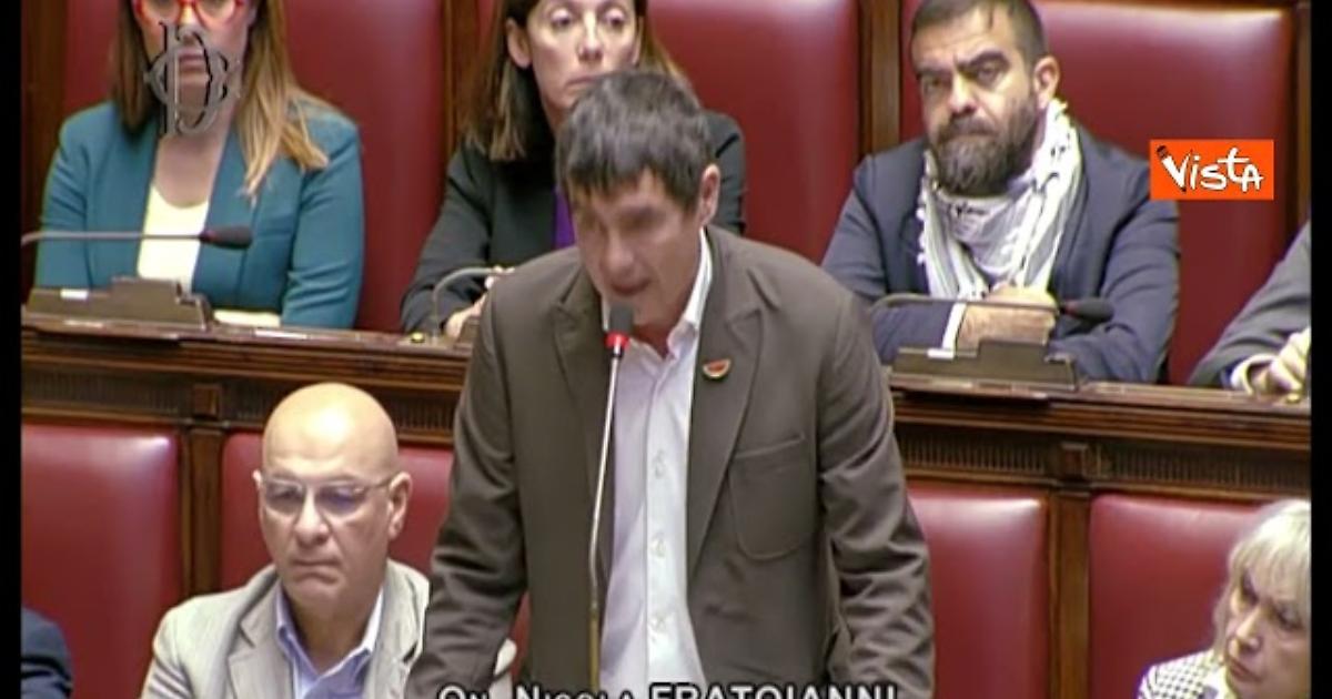 (Agenzia Vista) Roma, 21 maggio 2025 “Nei 700 giorni che hanno seguito il 7 ottobre la violenza indiscriminata, quella della guerra, delle armi, delle bombe, la violenza della fame, della sete, della carestia usate come arma di guerra, hanno travolto l'umanità, la nostra umanità e la vita di oltre 50.000 persone indifese rinchiuse in una gigantesca prigione a cielo aperto come è la Striscia di Gaza.” Così il deputato di Alleanza Verdi e Sinistra Nicola Fratoianni durante il suo intervetto alla Camera sulla mozione sulla Palestina. / Camera Fonte: Agenzia Vista / Alexander Jakhnagiev