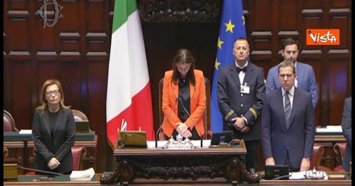 Il Ministro degli esteri Antonio Tajani chiede un minuto di silenzio per rendere omaggio alle vittime israeliane e palestinesi della guerra in Medio-oriente durante l'informativa urgente su Gaza alla Camera. / Camera