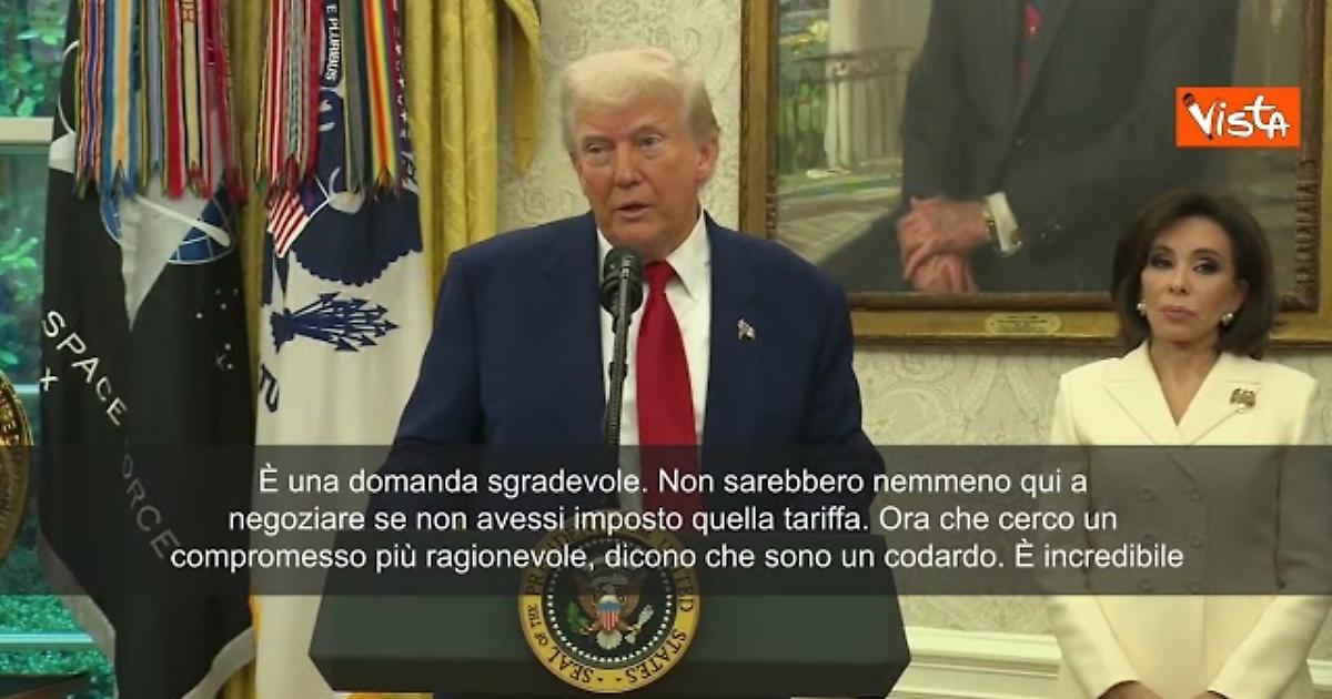 (Agenzia Vista) Usa, 29 maggio 2025 "È una domanda sgradevole. Non sarebbero nemmeno qui a negoziare se non avessi imposto quella tariffa. Ora che cerco un compromesso più ragionevole, dicono che sono un codardo. È incredibile", lo ha detto Trump parlando con i cronisti alla Casa Bianca, dopo essere stato definito Taco Trade, ovvero Trump Always Chickens Out (Trump torna sempre indietro) sulla questione dazi. X Fonte: Agenzia Vista / Alexander Jakhnagiev