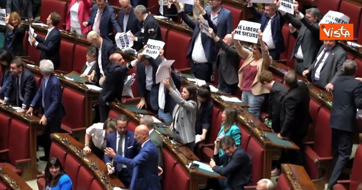 (Agenzia Vista) Roma, 29 maggio 2025 Bagarre nell'Aula della Camera prima del via libera al decreto sicurezza. Dai banchi delle opposizioni sono stati sollevati cartelli sui quali si legge: "Ne' liberi ne' sicuri", "Non si arresta la protesta", "La democrazia non si piega", "Decreto paura". M5s Fonte: Agenzia Vista / Alexander Jakhnagiev