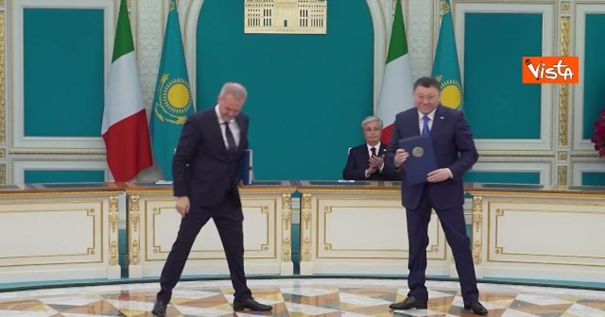 Meloni e il Presidente del Kazakistan Qasym Jomart Toqaev alla cerimonia dello scambio degli accordi