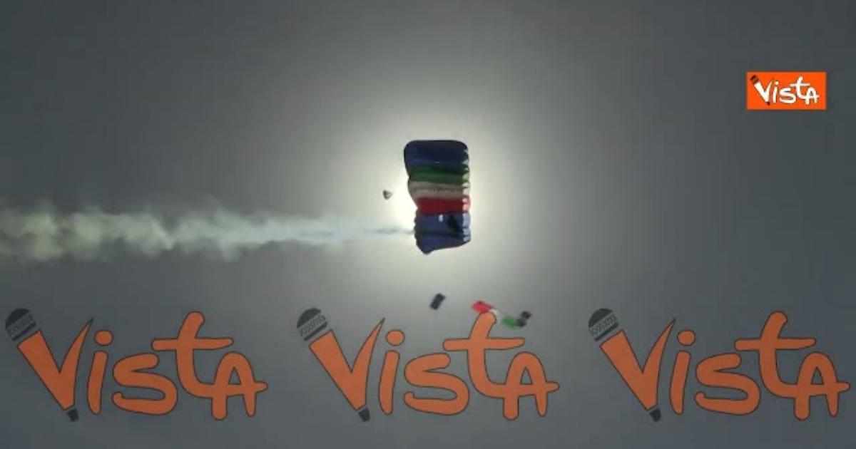2 Giugno, i paracadutisti della "Folgore" atterrano alla parata con un tricolore gigante