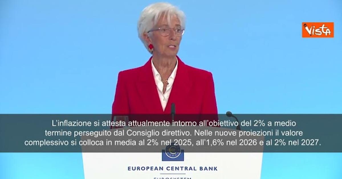 (Agenzia Vista) Francoforte, 05 giugno 2025 La Banca centrale europea taglia i tassi dal 2,25% al 2%. Con il taglio di oggi la Bce giunge alla fine del ciclo di politica monetaria, siamo ora ben posizionati a navigare in acque di estrema incertezza. Decideremo a seconda dei dati. L’inflazione si attesta attualmente intorno all’obiettivo del 2% a medio termine perseguito dal Consiglio direttivo. Nelle nuove proiezioni il valore complessivo si colloca in media al 2% nel 2025, all’1,6% nel 2026 e al 2% nel 2027. Bce Fonte: Agenzia Vista / Alexander Jakhnagiev